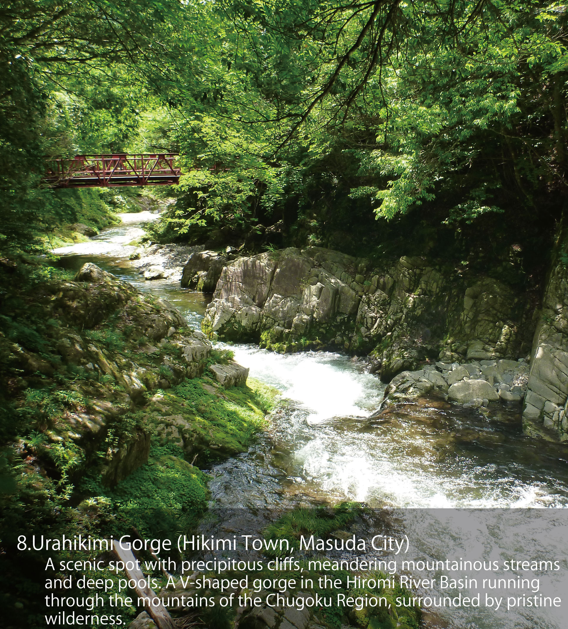 陡峭悬崖、蜿蜒溪流以及水潭绵延的风景名胜。地处流经山阴山阳的山地的广见川流域V形山谷中,周围的原始自然环境得到完好保留。
