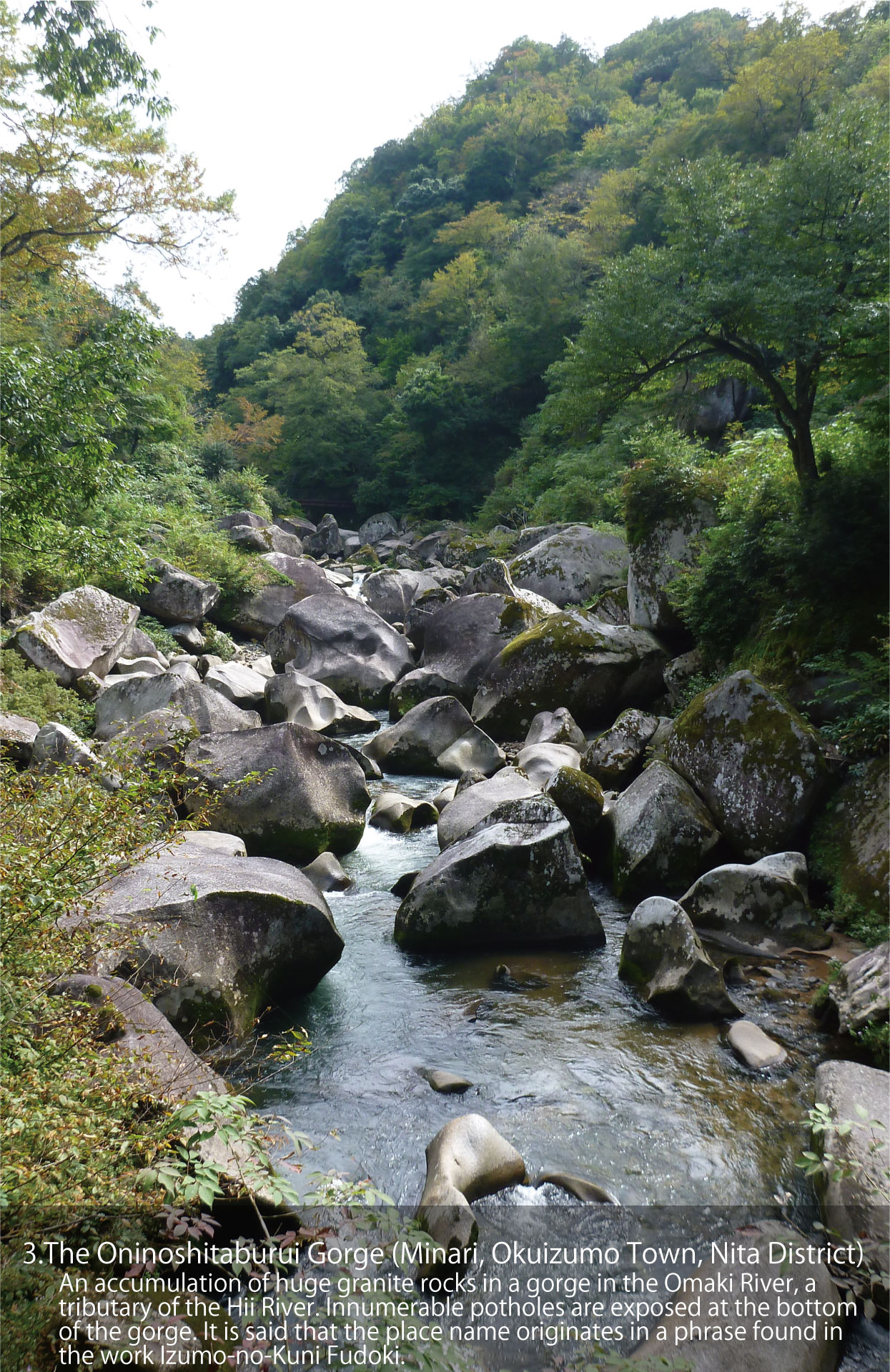 斐伊川的支流大馬木川的峽谷中層層疊疊堆積著花崗岩的巨石。谷底的岩石上露出著無數的甌穴。一般認為地名的由來是源自「出雲國風土記」中的一節。