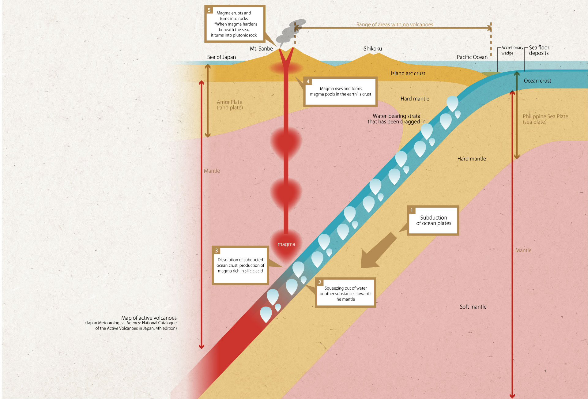 3.下沉的海洋地壳熔化,产生富含硅酸的岩浆