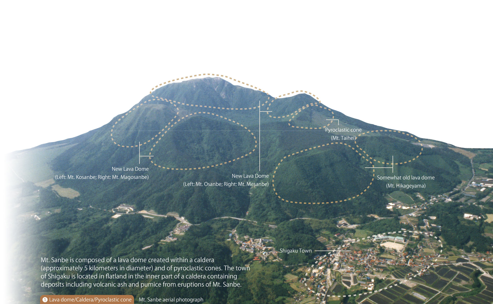 三瓶山由直径约5km的破火山口内部形成的熔岩穹丘与火山碎屑锥构成。志学之町位于破火山口内侧的平地,这里分布有过去三瓶山喷出的火山灰及浮石等沉积物。