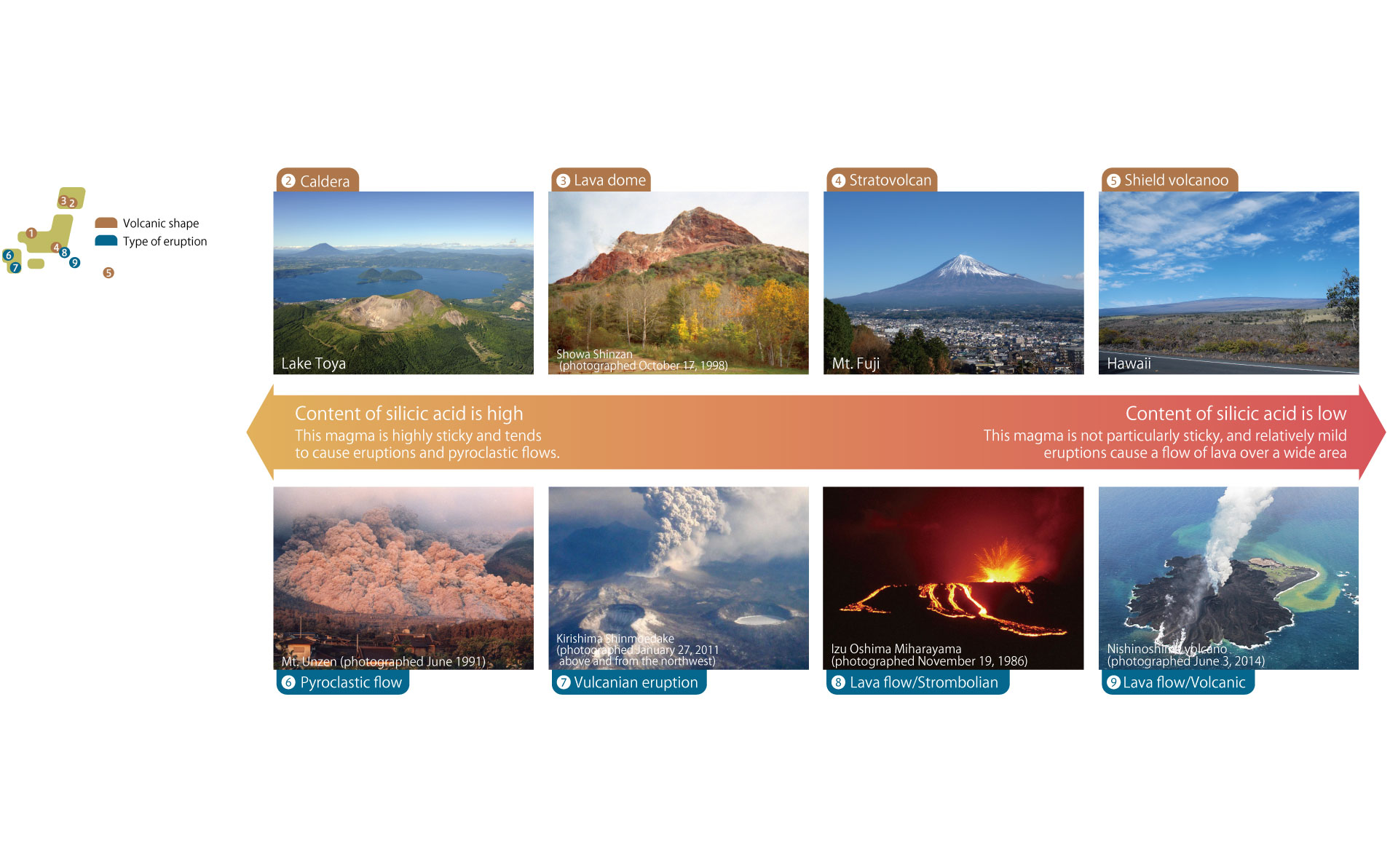 富士山等复式火山、阿苏的破火山口、夏威夷的盾状火山等种类繁多。三瓶火山由破火山口、熔岩穹丘(男三瓶等)、火山碎屑锥(大平山)等构成。