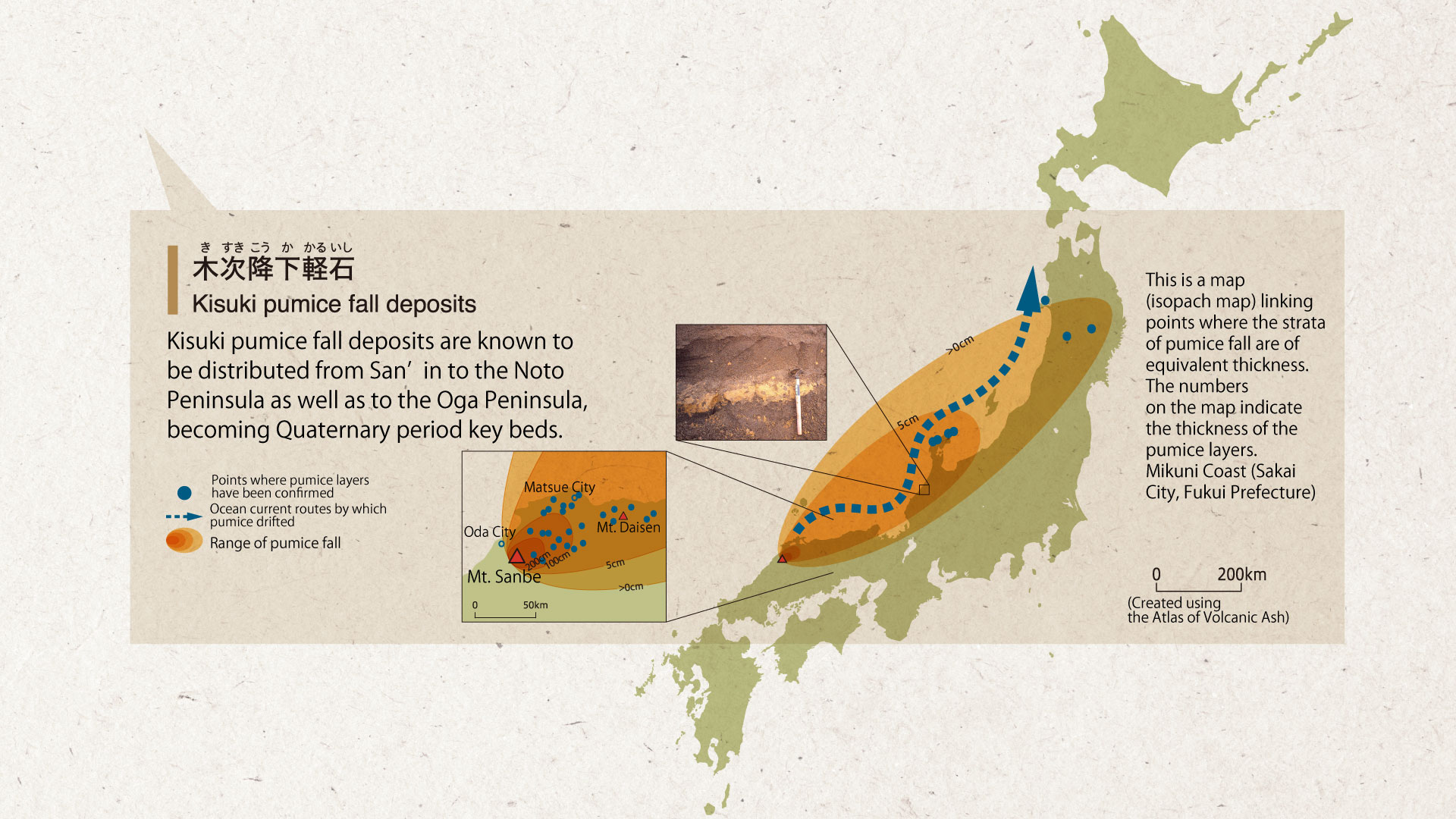 Kisuki pumice fall deposits are known to be distributed from San’in to the Noto Peninsula as well as to the Oga Peninsula, becoming Quaternary period key beds.