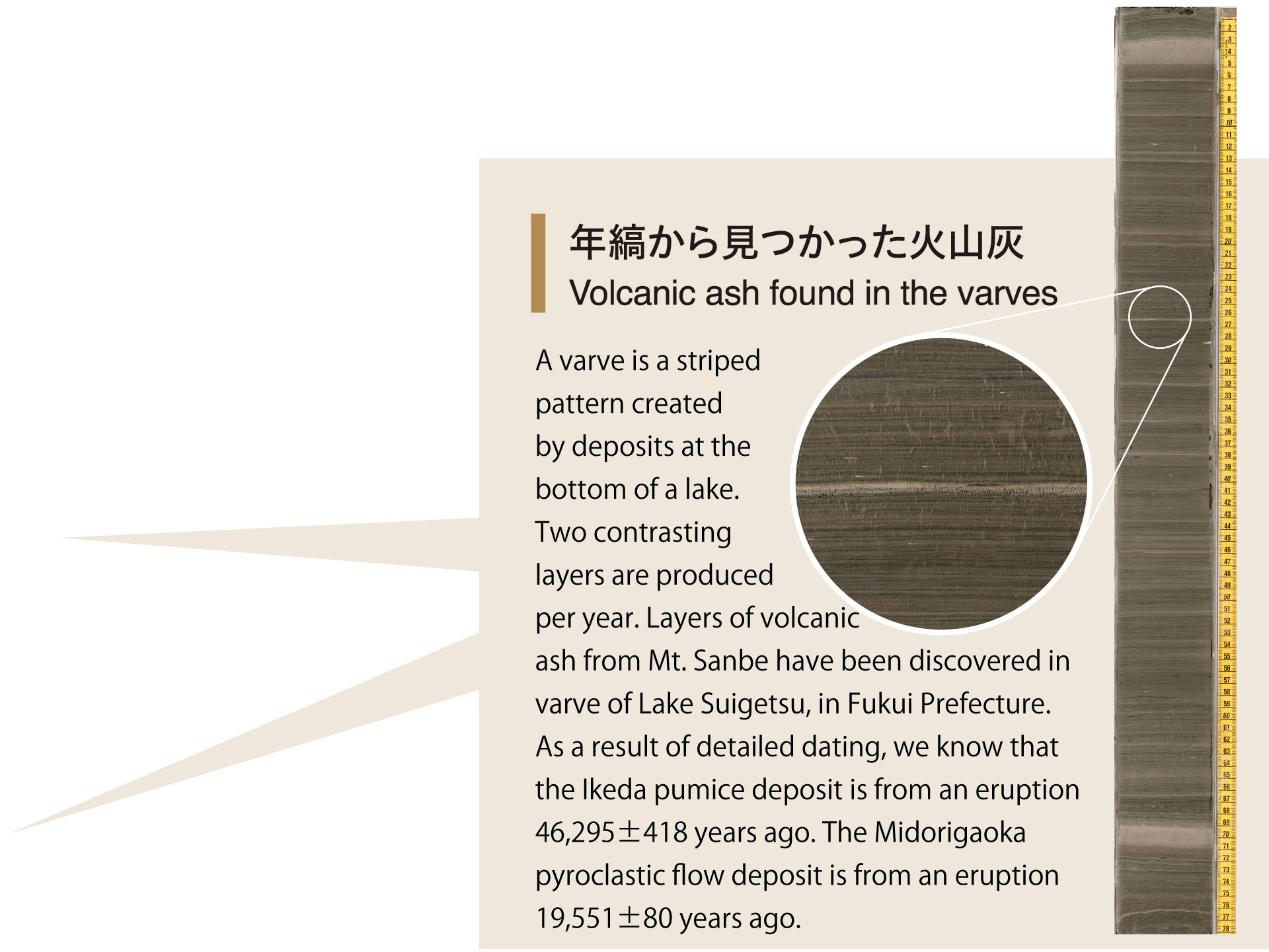 紋泥是指湖底等的沉積物中形成的條紋,1年會形成明暗2層條紋。福井縣水月湖的紋泥中,發現了多處來自三瓶山的火山灰。根據詳細的年代分析結果,確認池田浮石來自46,295±418年前的噴發,綠丘火山碎屑流來自19,551±80年前的噴發。