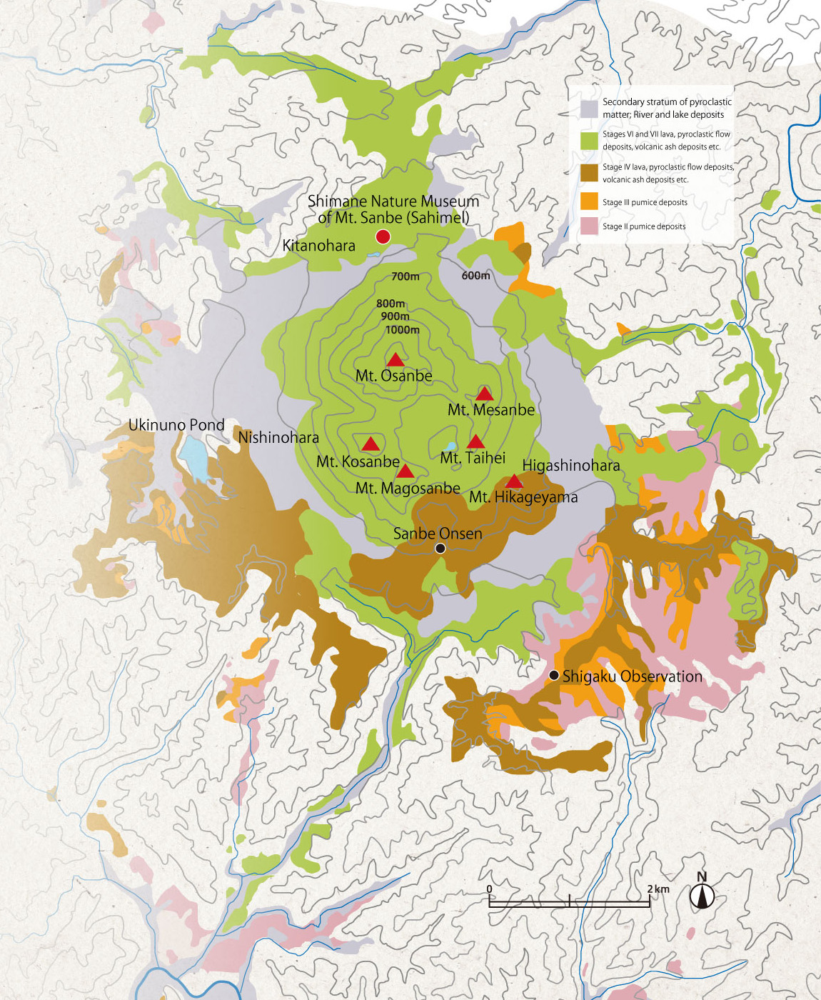 山間的低處分佈著以浮石和火山灰等為主體的火山碎屑沉積物,從中可以看出爆發式噴火形成的火山碎屑流將山谷填滿四處流散的情形。