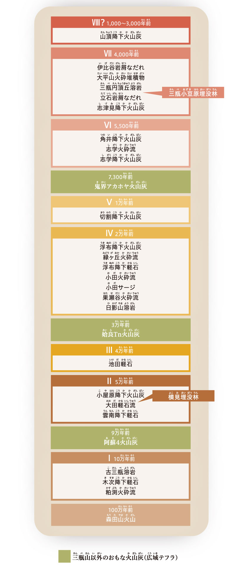 地層が語る三瓶山の歴史 三瓶山の噴出物が積み重なって出来た地層をはぎ取って作られたものです。最初の噴火は約10万年前に起こり、その後も何度かの大噴火を繰り返しており、噴火の歴史を地層から読み取ることができます。