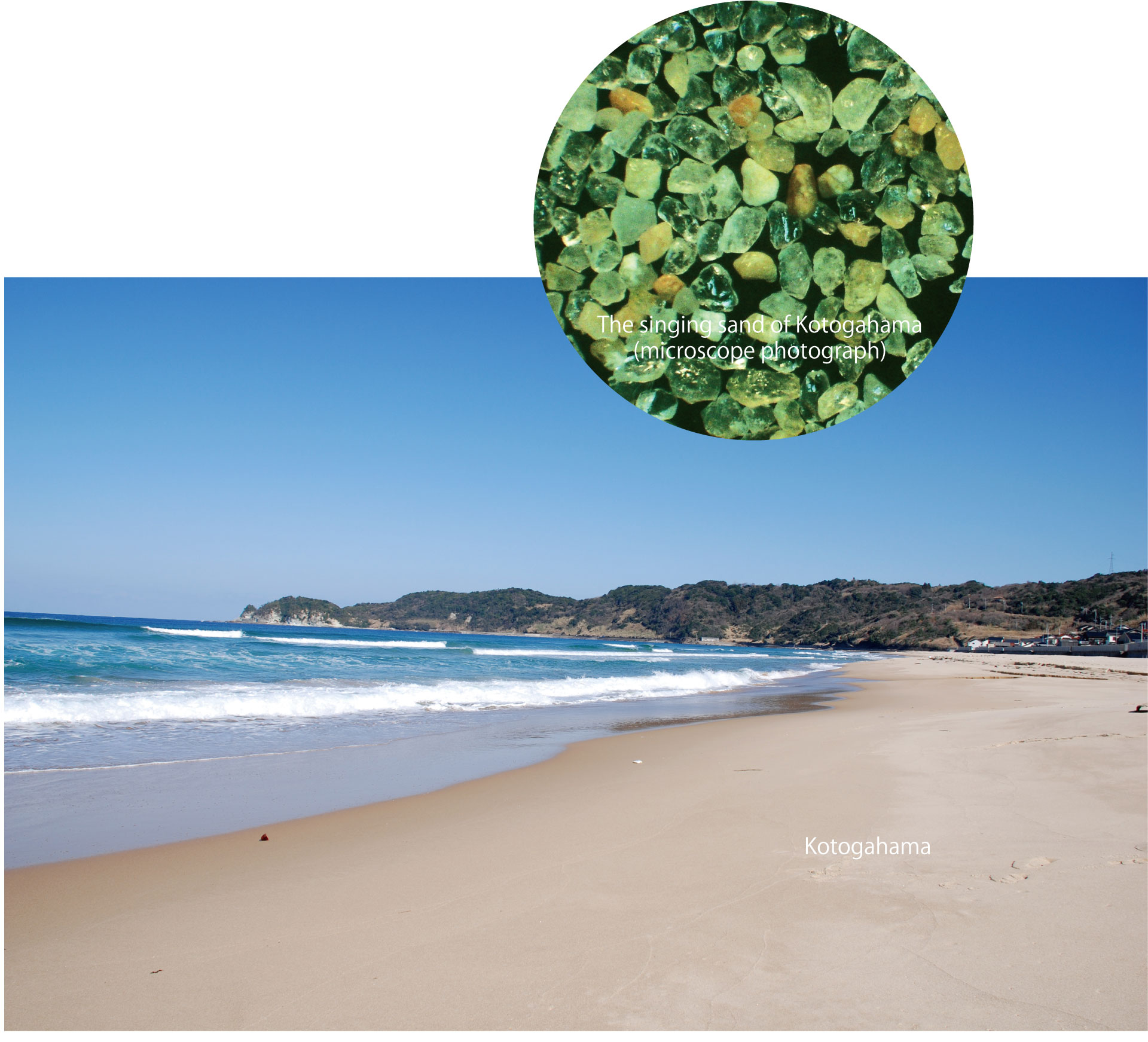 '나키스나(소리 나는 모래)'란 모래 위를 걸으면 끽끽 소리가 나고, 석영 성분이 있는 둥그스름한 모양의 모래입니다. 전국 각지에서 볼 수 있는데, 시마네현 내에서는 오다시 니마초 마지에 있는 고토가하마의 나키스나가 유명합니다.