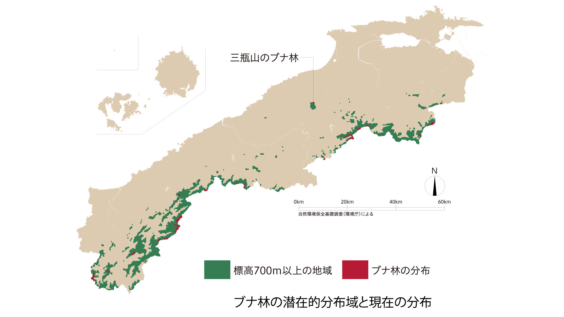 緑色の範囲は標高700m以上の地域を示しています。自然の状態であれば、ブナ林が広がると考えられる範囲です。赤色の範囲は、島根県内で現在、ブナ林がみられる範囲です。緑色の本来の分布域に比べて、非常に少なくなっていることが分かります。