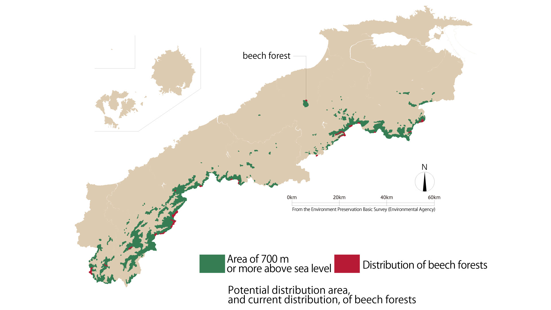 녹색은 표고 700m 이상 지역을 나타냅니다. 자연 그대로의 상태라면, 너도밤나무 숲이 펼쳐져 있을 것으로 추정되는 범위입니다. 빨간색은 현재 시마네현 내에서 너도밤나무 숲이 관찰되는 범위입니다. 녹색(원래의 분포 지역)에 비해 매우 적어졌음을 알 수 있습니다.